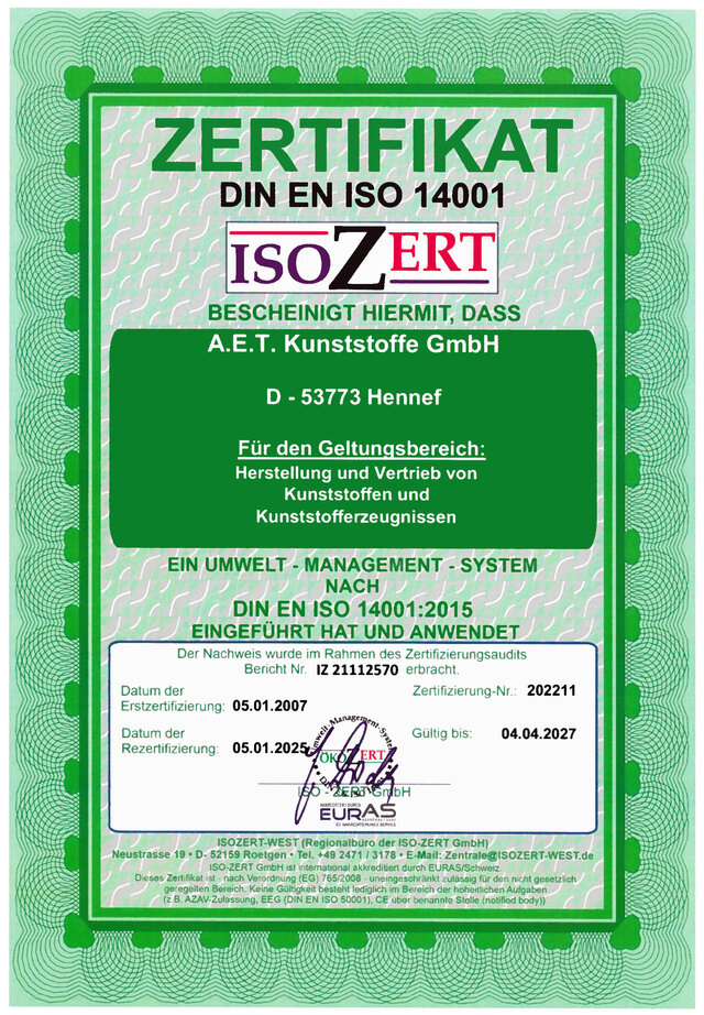 Allo stesso tempo, la nostra certificazione DIN EN ISO 14001 garantisce che abbiamo migliorato la nostra produzione secondo gli aspetti ecologici.