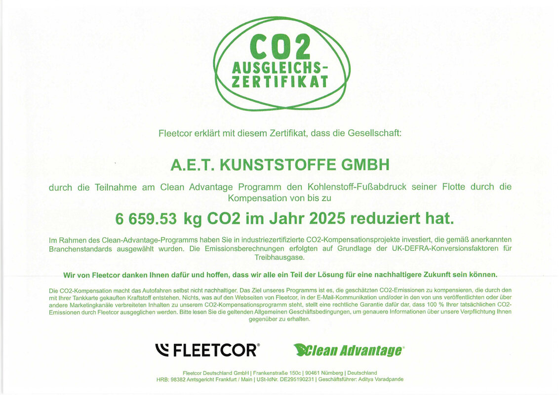 Bei AET Kunststoffe setzen wir auf Qualität und Umweltschutz. Dies belegen wir gern mit nachstehenden Zertifikaten aus den Bereichen ISO und erneuerbare Energien.